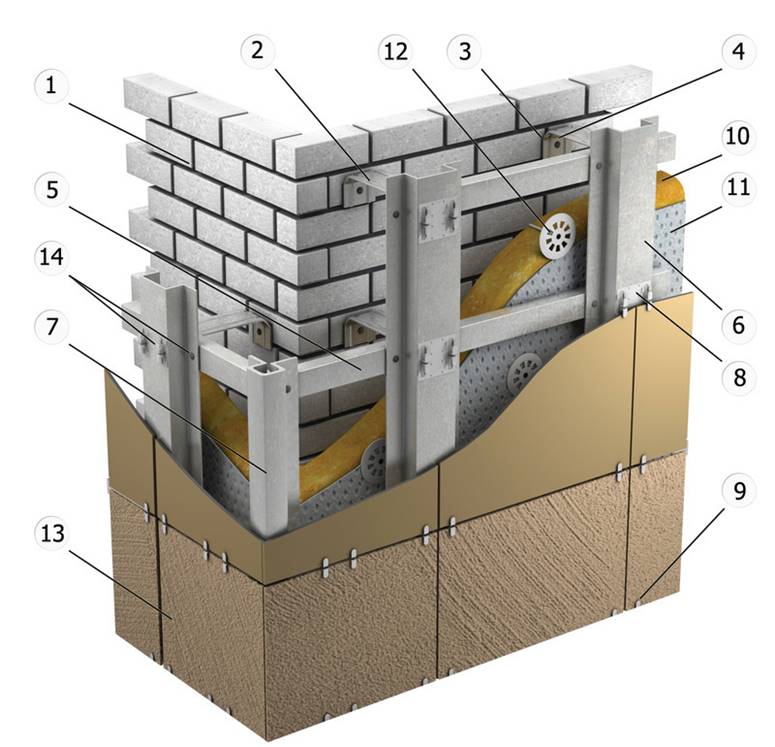 Вентилируемый фасад - это система, состоящая из облицовочных материалов, которые крепятся на стальной оцинкованный или алюминиевый каркас к несущему слою стены или к монолитному перекрытию. По зазору между облицовкой и стеной свободно циркулирует воздух, который убирает конденсат и влагу с конструкций.