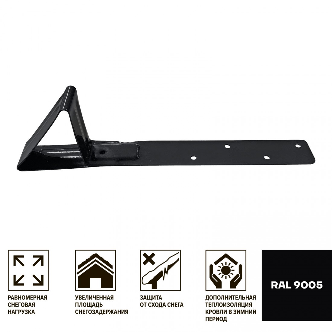 Снегозадержатель усиленный для гибкой черепицы Технониколь Ral 9005 черный, шт купить в Сургуте по оптовой цене в интернет магазине СтройПлатформа. Снегозадержатель усиленный для гибкой черепицы представляет собой металлический уголок с цветным полимерным покрытием на удлиненной ножке, который устанавливается непосредственно в процессе укладки кровельного покрытия. Этот элемент эффективно препятствует лавинообразному сходу снега, защищая водосточную систему и обеспечивая равномерную нагрузку на кровлю.