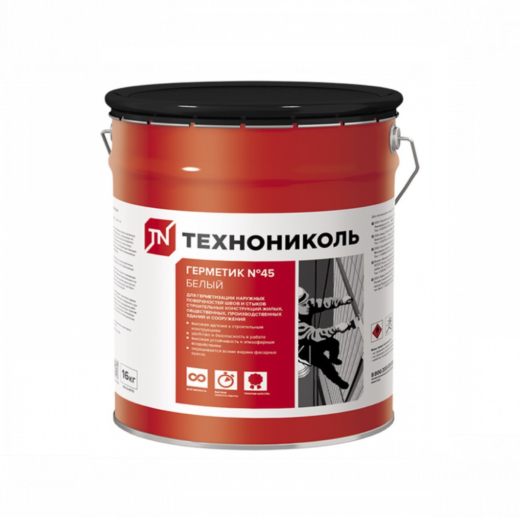 Герметик бутил-каучуковый ТехноНиколь №45 белый 16 кг, шт купить в Сургуте по оптовой цене в интернет магазине СтройПлатформа. Герметик ТехноНиколь №45 состоит из бутилкаучука, органического растворителя, модифицирующих добавок и наполнителя. Относится к материалам холодного отверждения.