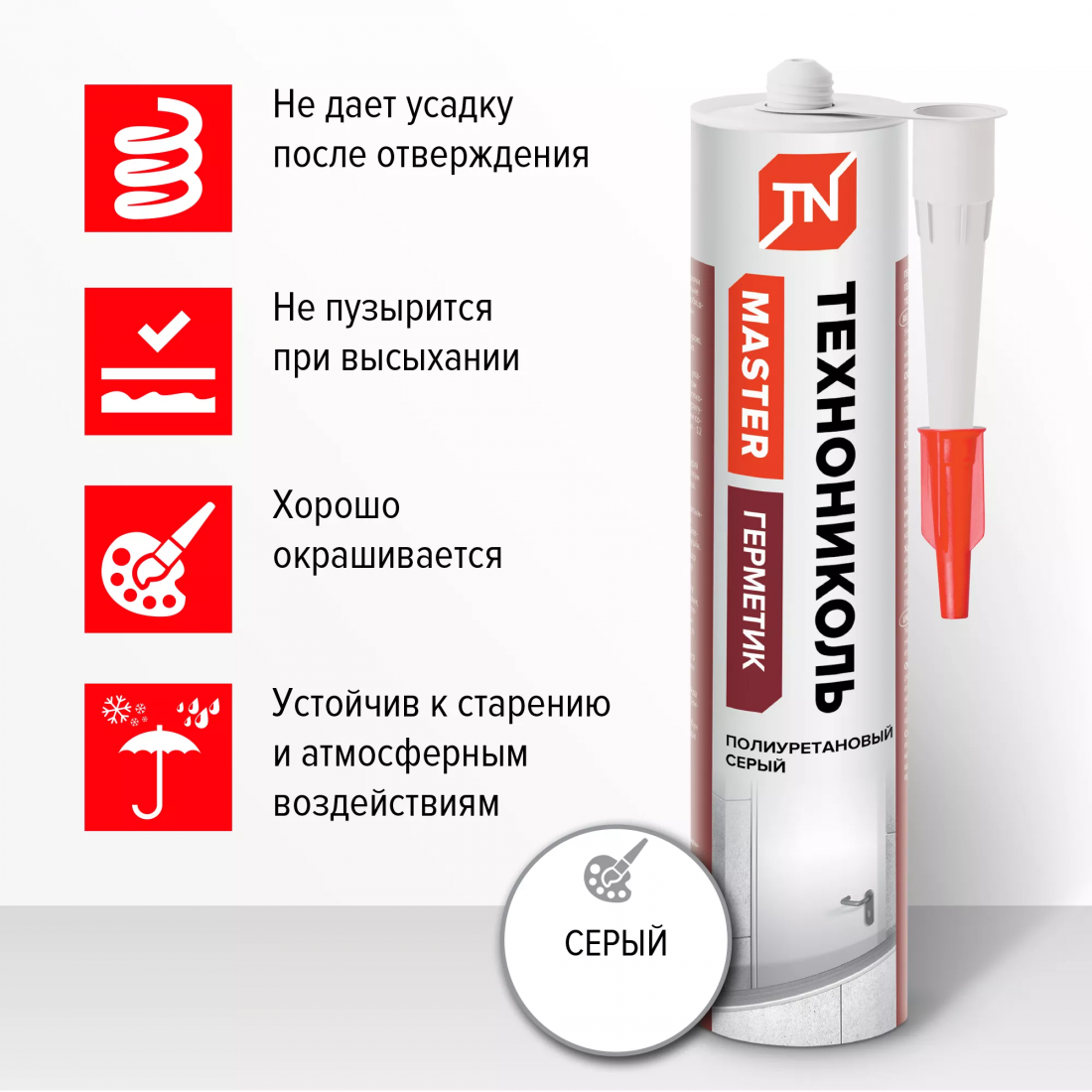 Герметик полиуретановый ТехноНиколь ПУ MASTER серый 310 мл, шт купить в Сургуте по оптовой цене в интернет магазине СтройПлатформа. Герметик ТехноНиколь ПУ MASTER это универсальный однокомпонентный полиуретановый герметик. Герметик полимеризуется под взаимодействием влаги воздуха с образованием прочного герметичного соединения.