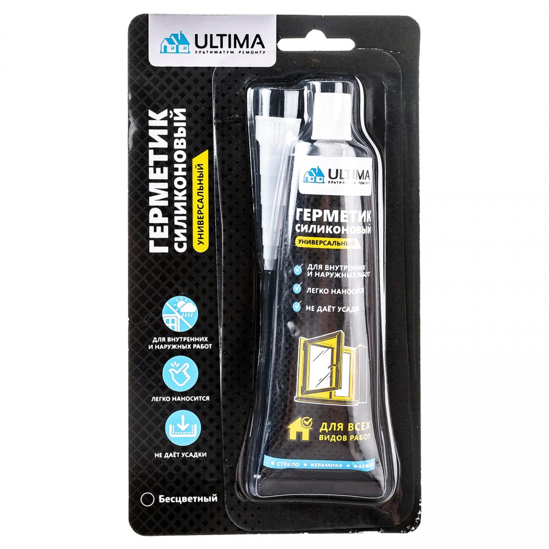 Герметик силиконовый Ultima универсальный в блистере прозрачный 80 мл, шт купить в Сургуте по оптовой цене в интернет магазине СтройПлатформа. Универсальный силиконовый кислотный герметик предназначен для уплотнения, соединения и защиты непористых поверхностей от проникновения воздуха и влаги, герметизации оконных рам, дверных коробок, витрин, стендов, панелей, герметизации стыков. Для наружных и внутренних работ. Тиксотропный, не растекается и не сползает по шву, быстро покрывается пленкой. Обеспечивает надежный эластичный шов с низкой усадкой, устойчивый к влажности, перепадам температур и УФ-лучам.