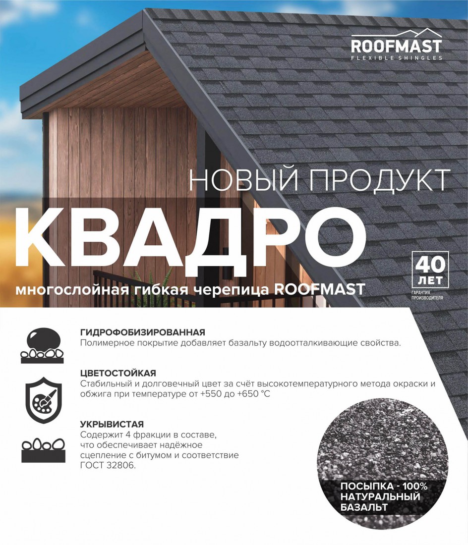 Гибкая черепица ROOFMAST коллекции КВАДРО — это современное многослойное кровельное покрытие, выполненное на основе прочного стеклохолста, пропитанного улучшенным битумом. Защитный слой покрыт натуральным базальтовым гранулятом, который обеспечивает долговечность и цветостойкость материала.