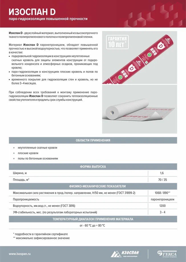 При соблюдении всех требований к монтажу применение паро-гидроизоляции Изоспан D позволяет сохранить теплоизоляционные свойства утеплителя и продлить срок службы конструкций.