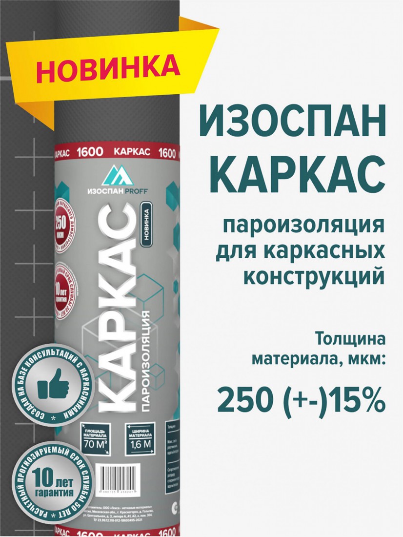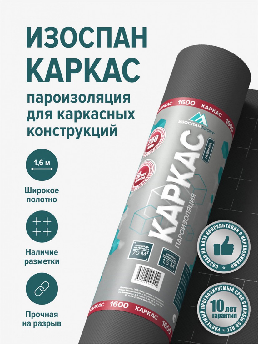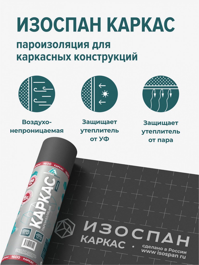 Изоспан КАРКАС — трёхслойный пароизоляционный материал, специально разработанный для каркасного домостроения. Представляет собой полотно из прочного нетканого материала, армированное с обеих сторон паронепроницаемыми полимерными плёнками. Обладает высокой прочностью, эластичностью и устойчив к разрыву и старению.