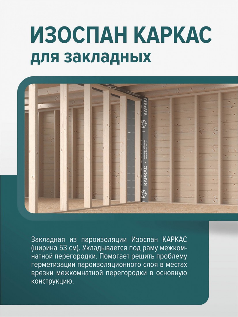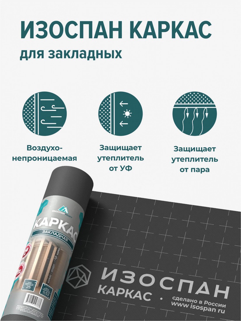 Изоспан КАРКАС — трёхслойный пароизоляционный материал, специально разработанный для каркасного домостроения. Представляет собой полотно из прочного нетканого материала, армированное с обеих сторон паронепроницаемыми полимерными плёнками. Обладает высокой прочностью, эластичностью и устойчив к разрыву и старению.