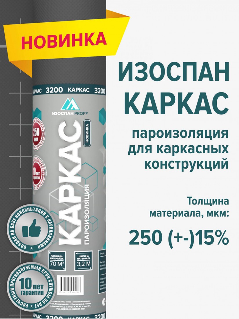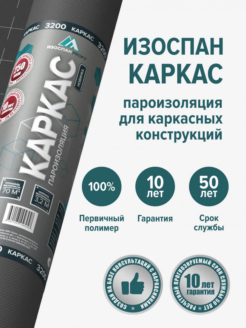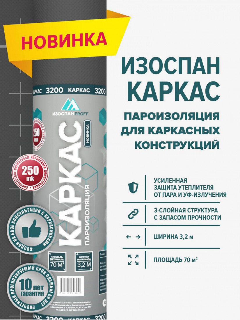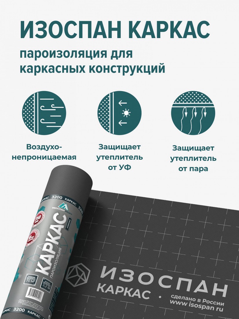 Изоспан КАРКАС — трёхслойный пароизоляционный материал, специально разработанный для каркасного домостроения. Представляет собой полотно из прочного нетканого материала, армированное с обеих сторон паронепроницаемыми полимерными плёнками. Обладает высокой прочностью, эластичностью и устойчив к разрыву и старению.