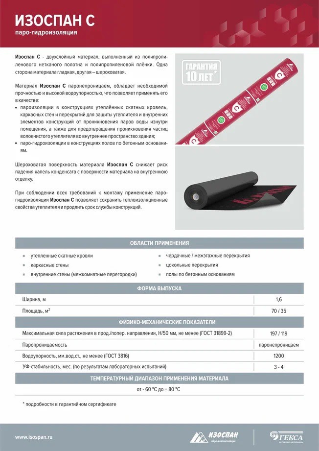 Применение: Материал Изоспан С обладает высоким сопротивлением паропроницанию, водоупорностью и необходимой прочностью, что позволяет применять его в качестве: