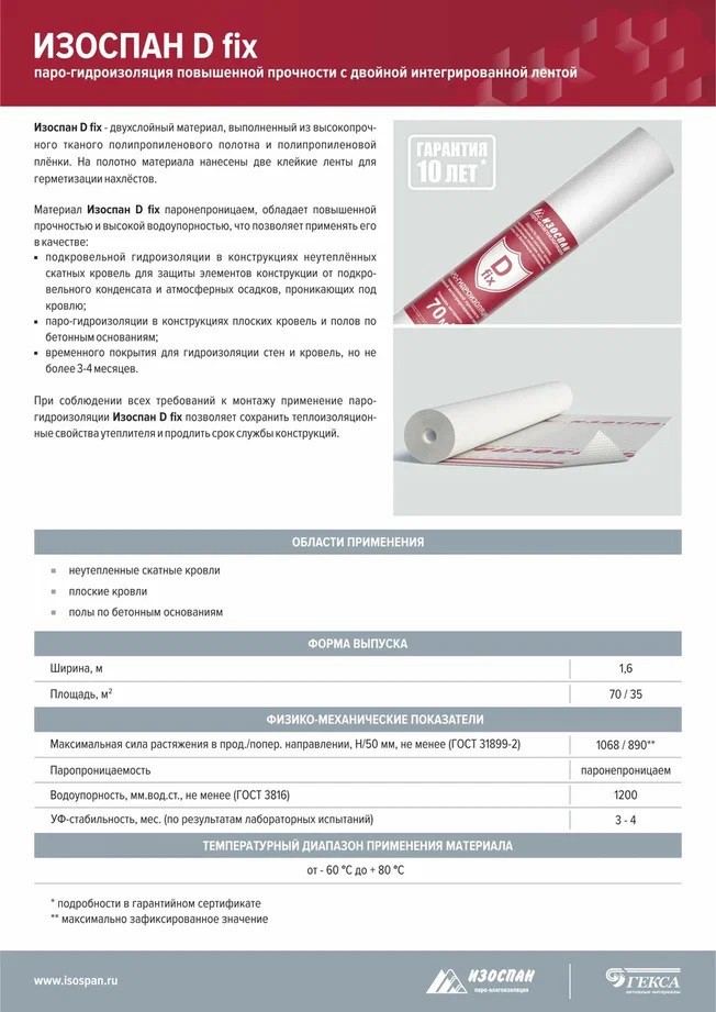 При соблюдении всех требований к монтажу применение паро-гидроизоляции Изоспан D fix позволяет сохранить теплоизоляционные свойства утеплителя и продлить срок службы конструкций.