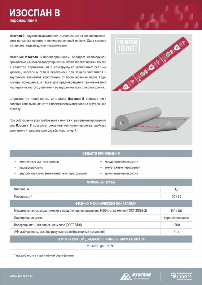 Применение:- Защита утеплителя от проникновения влаги (утепление чердачных, цокольных и межэтажных перекрытий, скатных кровель, внутренних и каркасных стен);