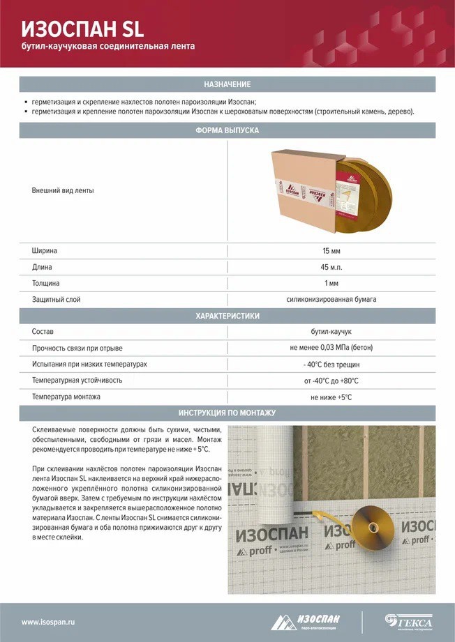 Склеиваемые поверхности должны быть сухими, чистыми, обеспыленными, свободными от грязи и масел. Монтаж рекомендуется проводить при температуре не ниже +15 °С. При склеивании нахлестов полотен пароизоляции «Изоспан» лента Изоспан SL наклеивается на верхний край нижерасположенного укрепленного полотна силиконизированной бумагой вверх. Затем с требуемым по инструкции нахлестом укладывается и закрепляется вышерасположенное полотно материала «Изоспан». С ленты Изоспан SL снимается силиконизированная бумага, и оба полотна прижимаются друг к другу в месте склейки.