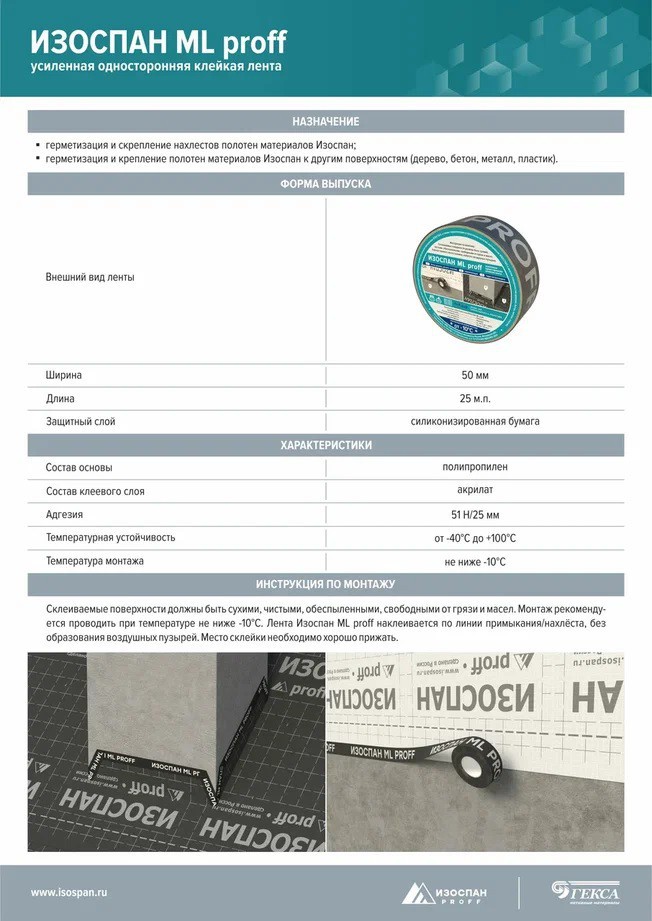 Изоспан ML proff демонстрирует высокую начальную адгезию как при комнатной, так и при низкой температуре. Он великолепно склеивает и ПЭ- ПП- плёнки, и также сильнопористые и неровные материалы.