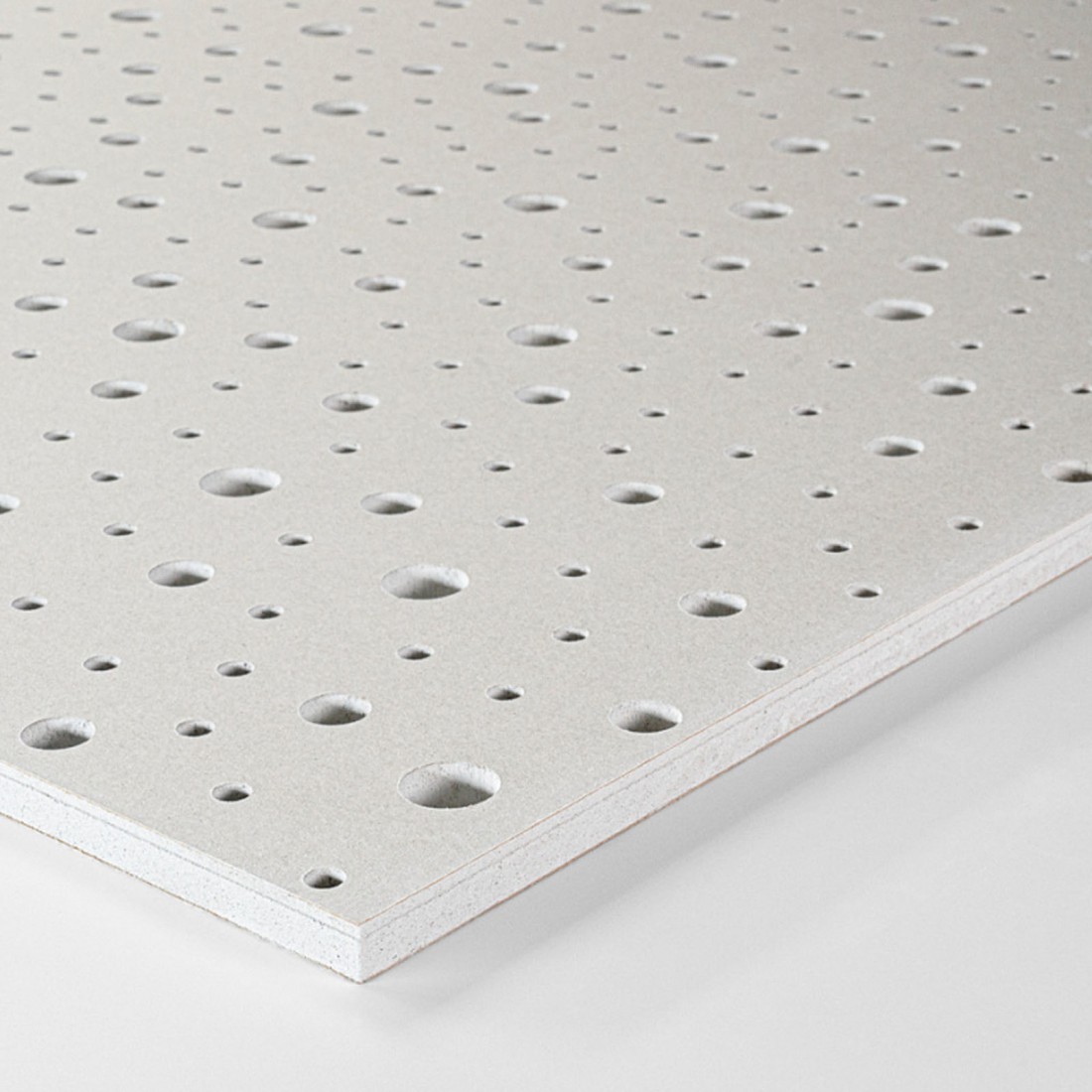 КНАУФ-Акустика - перфорированный гипсокартонный лист с обрезанными кромками различной формы и наклеенным на тыльную сторону звукопоглощающим слоем нетканого полотна. Производится с разным типом перфорации и обладают индексом звукопоглощения 0,55 до 0,70. Применяется для устройства подвесных потолков и облицовок стен в зданиях и помещениях с сухим и нормальным влажностными режимами по СНиП 23-02-2003.
