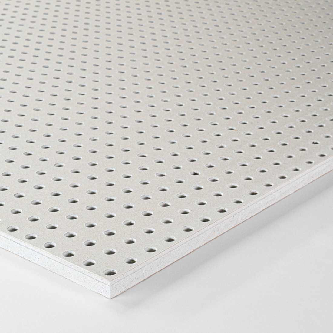 КНАУФ-Акустика - перфорированный гипсокартонный лист с обрезанными кромками различной формы и наклеенным на тыльную сторону звукопоглощающим слоем нетканого полотна. Производится с разным типом перфорации и обладают индексом звукопоглощения 0,55 до 0,70. Применяется для устройства подвесных потолков и облицовок стен в зданиях и помещениях с сухим и нормальным влажностными режимами по СНиП 23-02-2003.