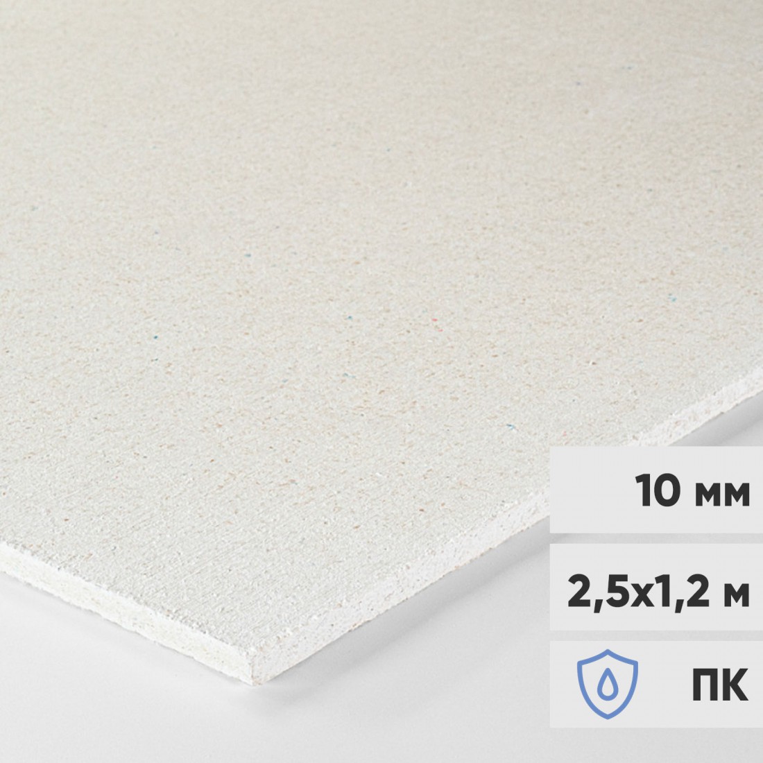 Гипсоволокнистый лист влагостойкий Кнауф-Суперлист ГВЛВ ПК 2500х1200х10 мм, лист купить в Сургуте по оптовой цене в интернет магазине СтройПлатформа. КНАУФ-суперлист ГВЛВ - однородный материал с высокой плотностью. Производится прессованием смеси гипсового вяжущего и волокон распушенной макулатуры. Обработан гидрофобизатором. Применяется в звукоизоляционных, огнестойких и ударостойких конструкциях в зданиях и помещениях с сухим, нормальным и влажным влажностными режимам,, в том числе в неотапливаемых помещениях.