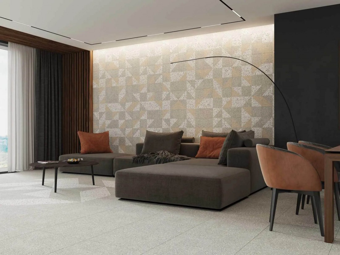 При укладке керамогранитной плитки в стиле терраццо получается единое, бесшовное полотно, которое органично впишется в интерьер любой комнаты - достаточно лишь правильно подобрать цветовую палитру. Практичный дизайн и безупречные механические характеристики керамогранита сочетаются в коллекции Cosmos. Покрытие не впитывает воду, устойчиво к высоким температурам и воздействию химических средств. Также плитка из этой коллекции отличается высокой степенью детализации и представлена в двух размерах: 60х60 и 60х120см, толщиной 1см.