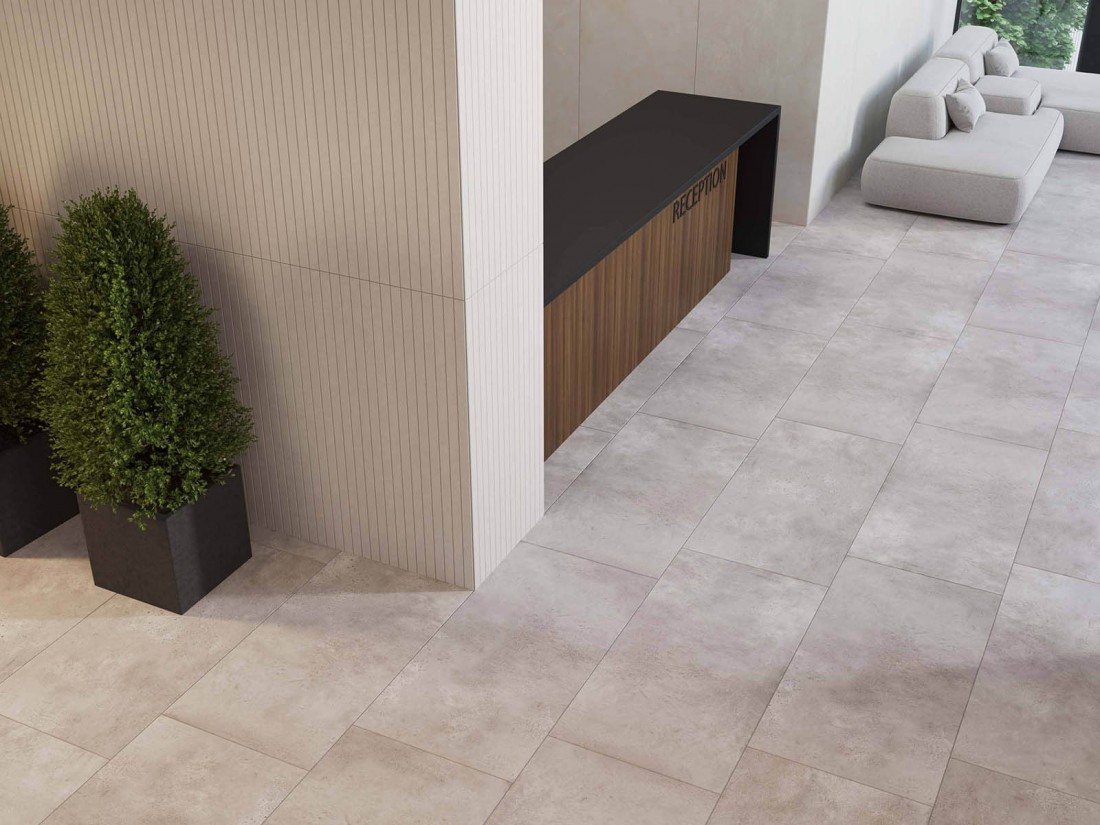 Керамогранит производится с использованием экологически чистых материалов и технологии DigitalPrint, что обеспечивает высокую достоверность текстуры бетона. Благодаря ректификации плитка легко укладывается с минимальными швами, а её высокая прочность (износостойкость PEI IV) гарантирует долговечность даже в условиях интенсивной эксплуатации.