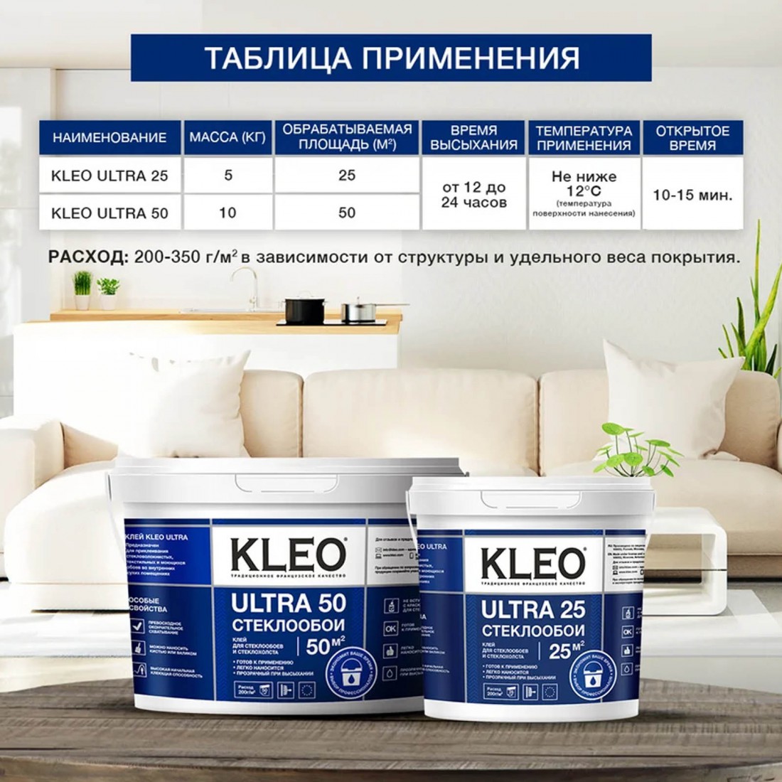 Клей для обоев KLEO ULTRA используется для наклеивания стеклообоев, обоев на флизелиновой основе, стеклохолстов различной плотности, текстильных и виниловых обоев.