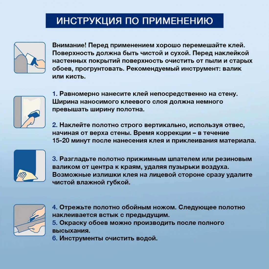 Время приготовления обойного клея 5 минут. В разведенном состоянии в плотно закрытой таре он может хранится до 10 дней. Обойный клей сохраняет прозрачность после высыхания, а обои легко корректируются при наклейке. Клеевой состав не вступает в реакцию с красками для стеклообоев. Время полного высыхания: 8-24 часа при температуре + 18⁰С.