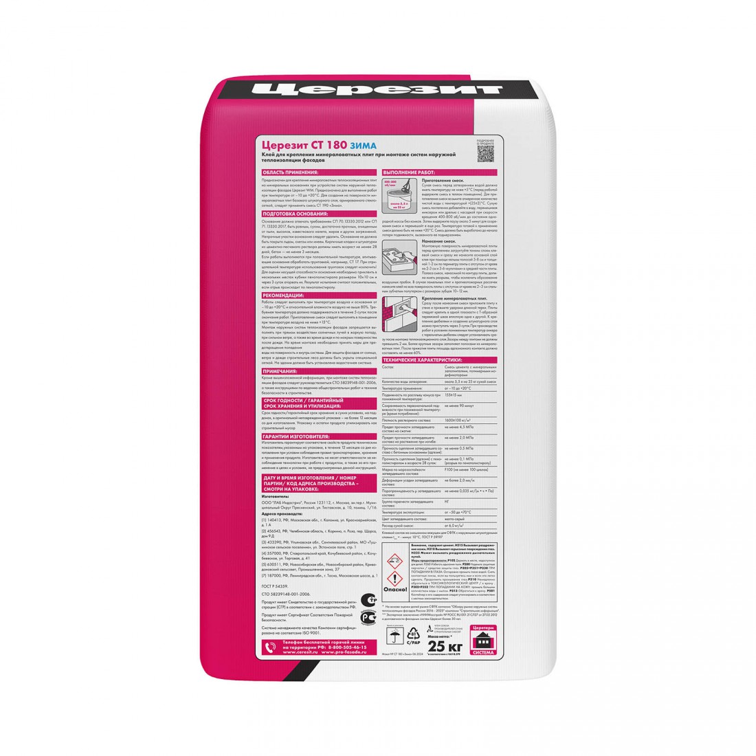 Клей Церезит СТ 180 ЗИМА для минераловатных плит 25 кг, шт купить в Сургуте по оптовой цене в интернет магазине СтройПлатформа. Клей Церезит CT 180 предназначен для надежного крепления минераловатных теплоизоляционных плит на минеральных основаниях в системах фасадных теплоизоляционных композиционных (СФТК). Состав на цементной основе обеспечивает высокую прочность сцепления и долговечность покрытия. Этот клей также используется для создания базового штукатурного слоя на минераловатных плитах, а для армирования рекомендуется использовать смесь CT 190.