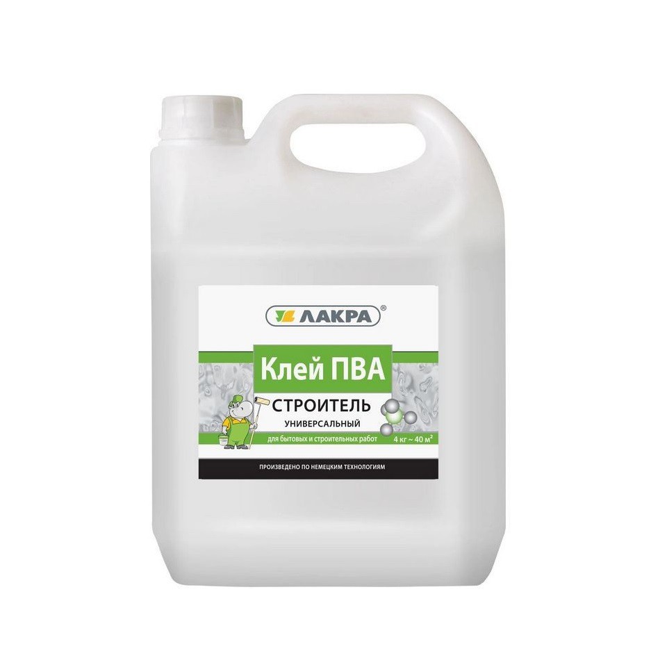 Клей ПВА Лакра Строитель 4 кг, шт купить в Сургуте по оптовой цене в интернет магазине СтройПлатформа. Высококачественный клей на основе водной дисперсии ПВА. Обладает высокой прочностью склеивания и оптимальным временем схватывания. После высыхания образует эластичную прозрачную пленку.