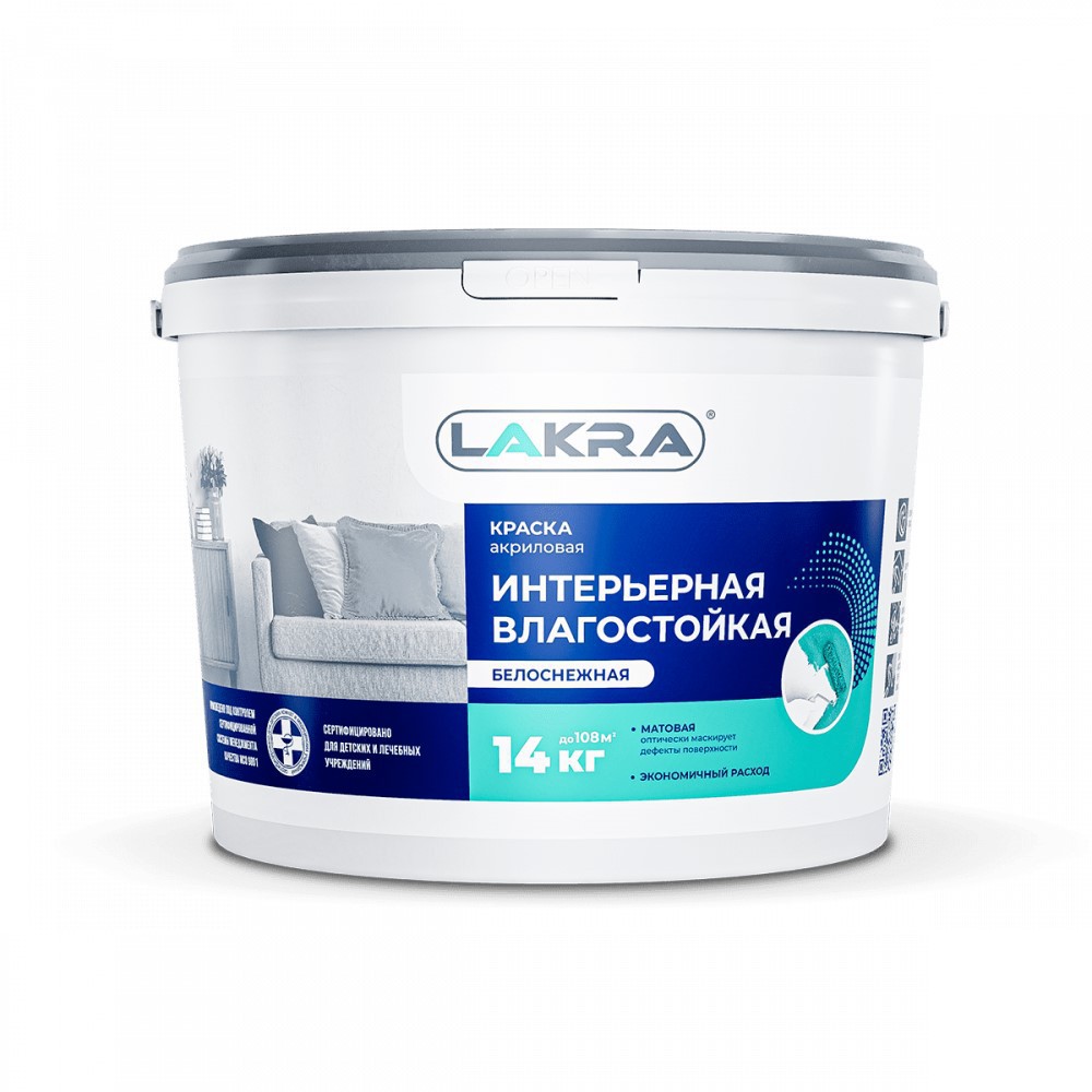 Краска Лакра Интерьерная влагостойкая повышенной белизны 14 кг, шт купить в Сургуте по оптовой цене в интернет магазине СтройПлатформа. Краска Лакра Интерьерная влагостойкая повышенной белизны применяется для окраски стен и потолков в помещениях с умеренной эксплуатационной нагрузкой и нормальной влажностью – коридор, гостиная. Наносится на кирпичные, бетонные, оштукатуренные, деревянные и другие пористые поверхности, кроме полов.