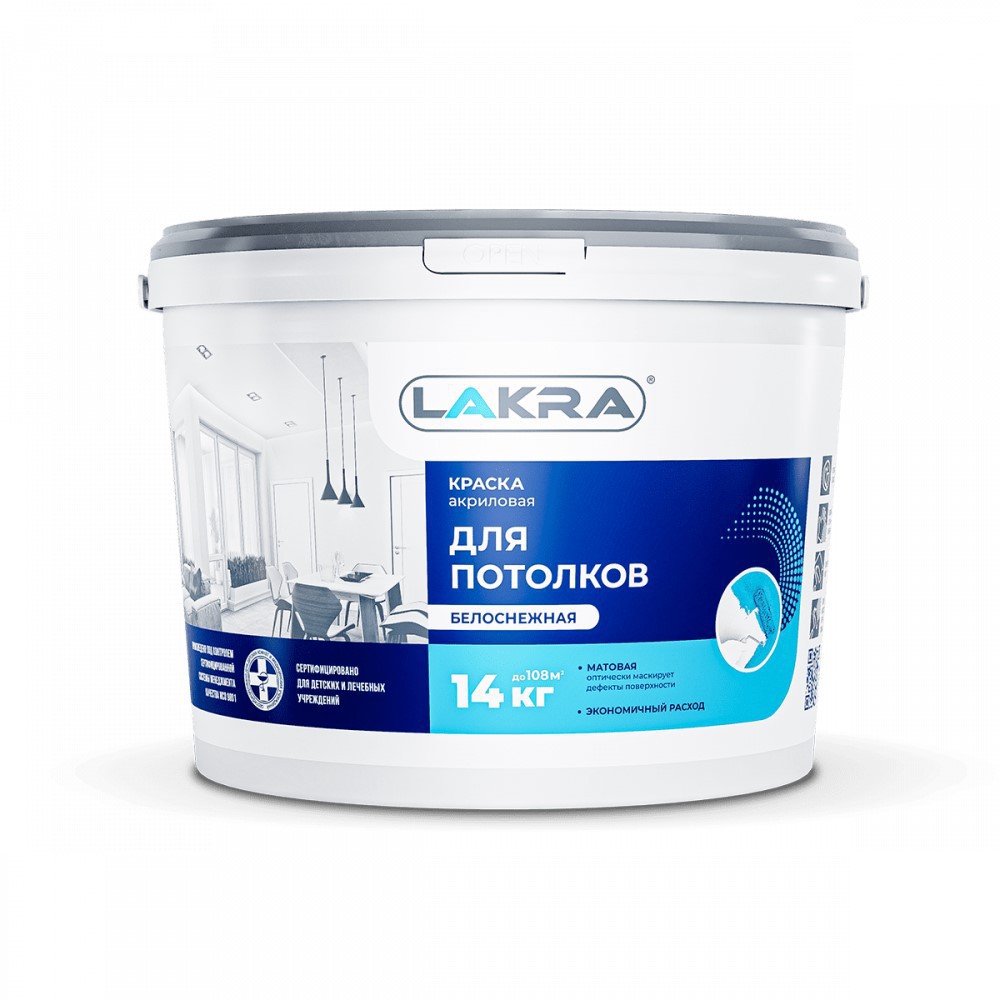 Краска Лакра Для потолков белоснежная 14 кг, шт купить в Сургуте по оптовой цене в интернет магазине СтройПлатформа. Краска Лакра Для потолков белоснежная применяется для окраски потолков помещений с нормальной влажностью. Наносится на бетонные, кирпичные, оштукатуренные и другие минеральные поверхности.
