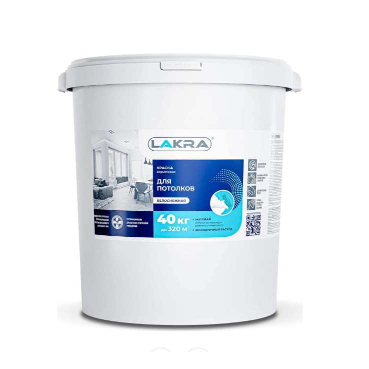 Краска Лакра Для потолков белоснежная 40 кг, шт купить в Сургуте по оптовой цене в интернет магазине СтройПлатформа. Краска Лакра Для потолков белоснежная применяется для окраски потолков помещений с нормальной влажностью. Наносится на бетонные, кирпичные, оштукатуренные и другие минеральные поверхности.