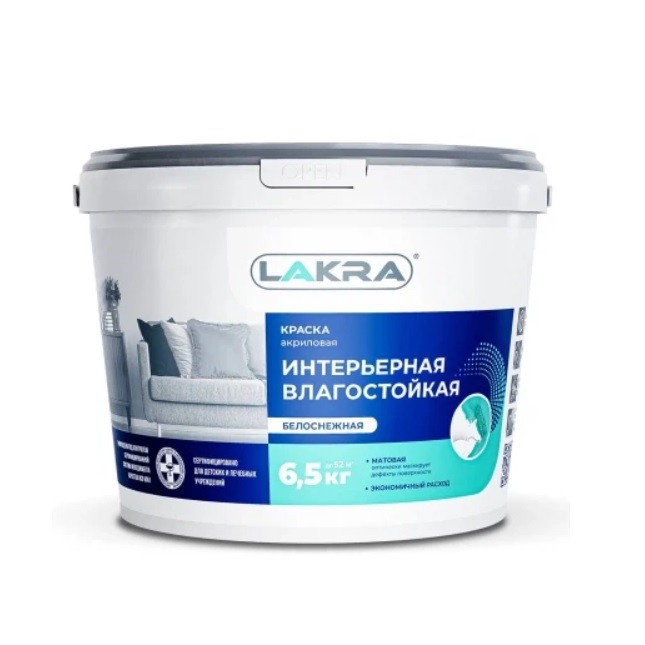 Краска Лакра Интерьерная влагостойкая повышенной белизны 6,5 кг, шт купить в Сургуте по оптовой цене в интернет магазине СтройПлатформа. Краска Лакра Интерьерная влагостойкая повышенной белизны применяется для окраски стен и потолков в помещениях с умеренной эксплуатационной нагрузкой и нормальной влажностью – коридор, гостиная. Наносится на кирпичные, бетонные, оштукатуренные, деревянные и другие пористые поверхности, кроме полов.