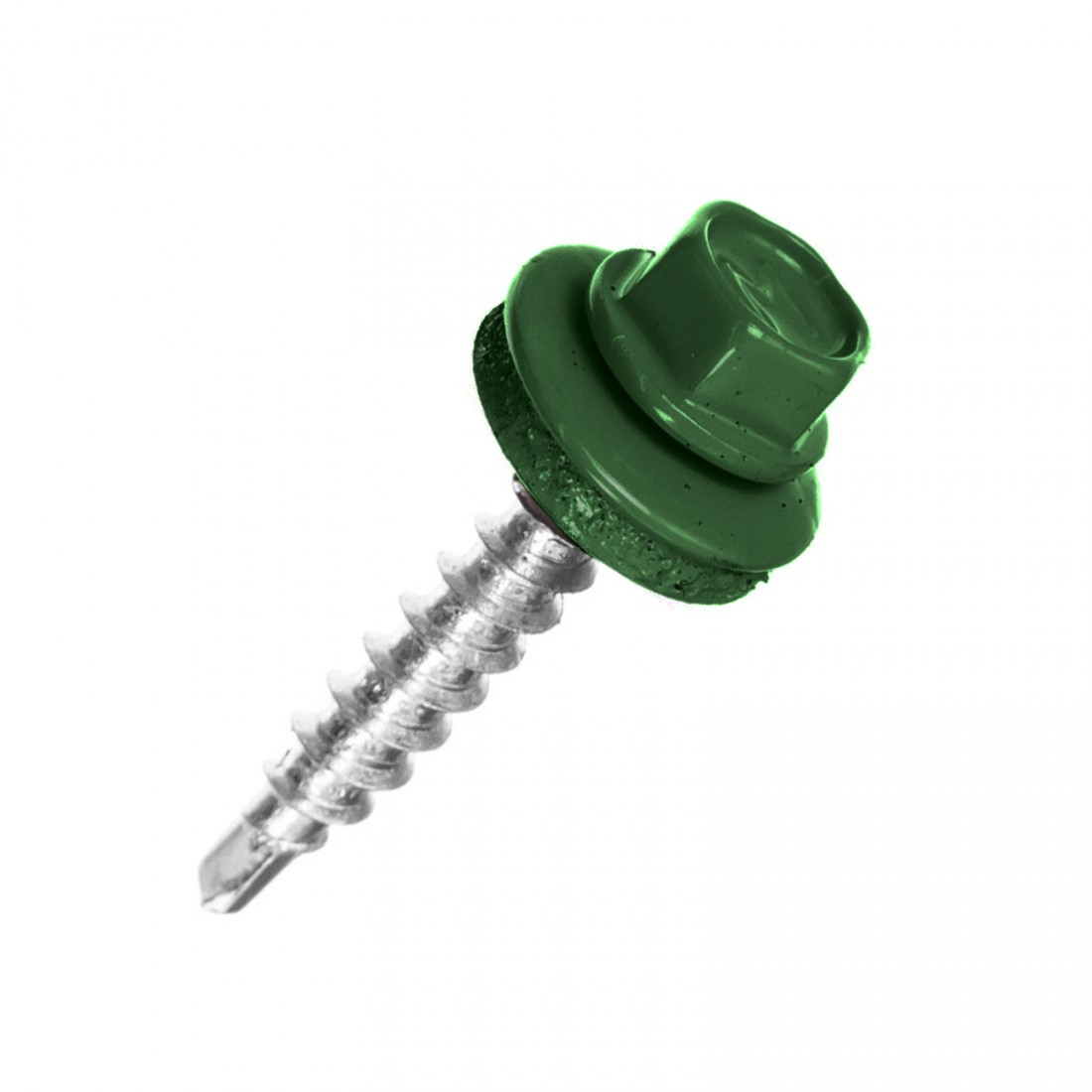 Саморез кровельный сверло 4,8х35 мм металл-дерево RAL 6005 зеленый мох, 250 шт/упак купить в Сургуте по оптовой цене в интернет магазине СтройПлатформа. Крепежный элемент со сверлом, шайбой и резиновой уплотняющей прокладкой, выполнен из оцинкованной стали, окрашенен в соответствии с RAL. Имеет шестигранную головку и шлиц в виде шестигранника под торцевую биту 8.