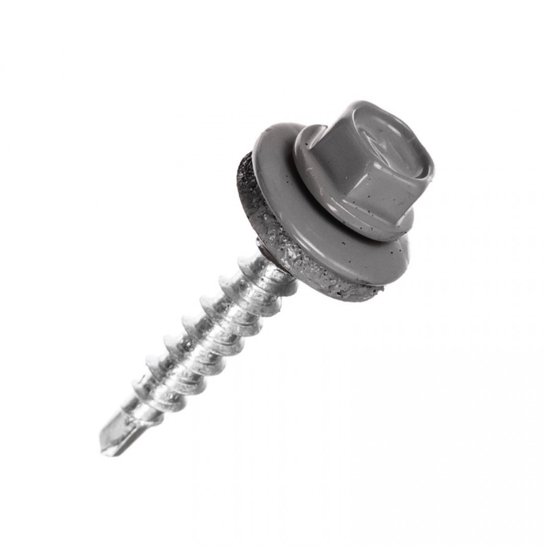 Саморез кровельный сверло 4,8х35 мм металл-дерево RAL 7004 серый, 250 шт/упак купить в Сургуте по оптовой цене в интернет магазине СтройПлатформа. Крепежный элемент со сверлом, шайбой и резиновой уплотняющей прокладкой, выполнен из оцинкованной стали, окрашенен в соответствии с RAL. Имеет шестигранную головку и шлиц в виде шестигранника под торцевую биту 8.