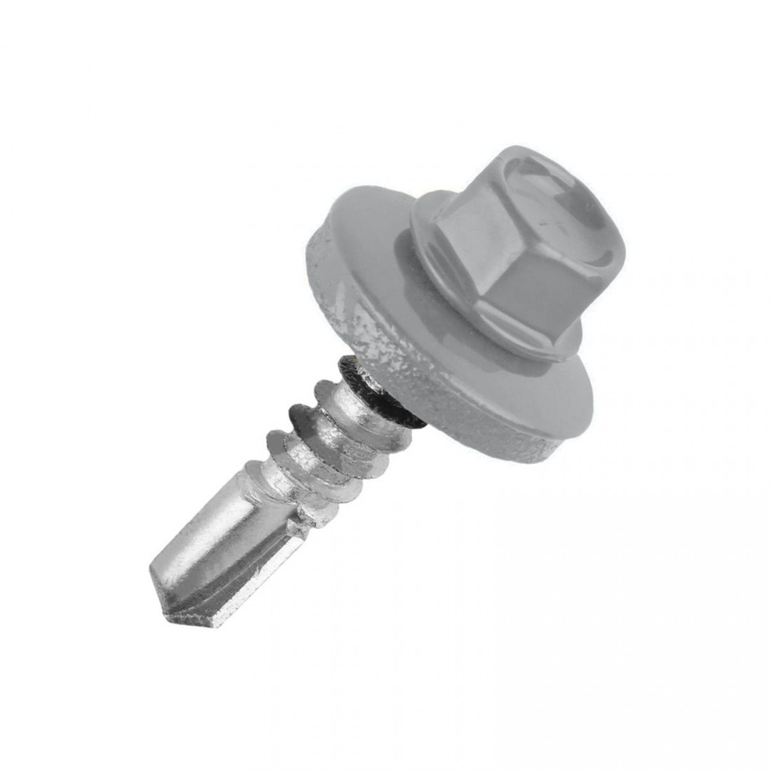 Саморез кровельный сверло 5,5х19 мм металл-металл RAL 7004 серый, 250 шт/упак купить в Сургуте по оптовой цене в интернет магазине СтройПлатформа. Крепежный элемент со сверлом, шайбой и резиновой уплотняющей прокладкой, выполнен из оцинкованной стали, окрашенен в соответствии с RAL. Имеет шестигранную головку и шлиц в виде шестигранника под торцевую биту 10.