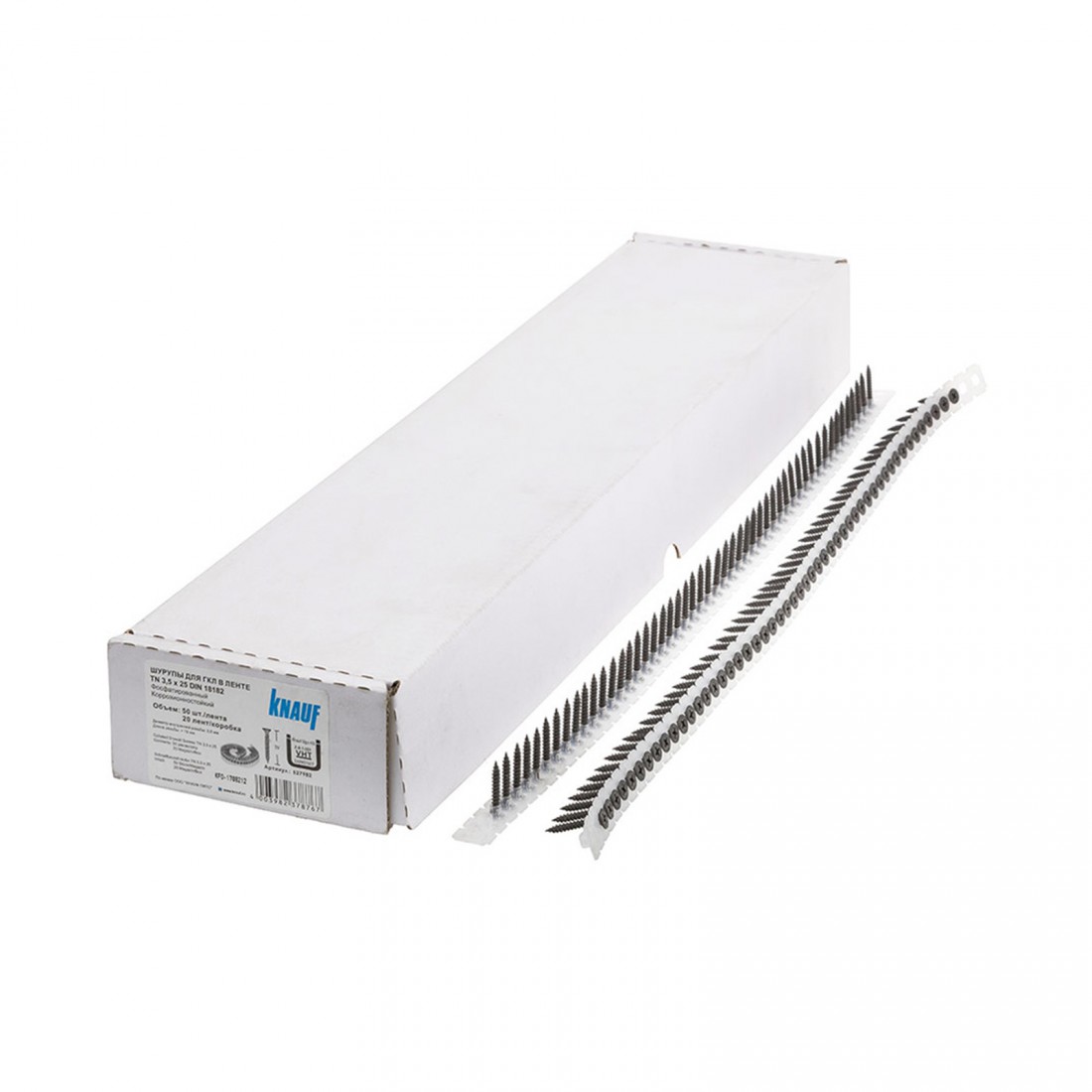 Саморез в ленте для гипсокартона Knauf TN острый 3,5х25 мм металл-гипсокартон самонарезающий, 1000 шт/упак купить в Сургуте по оптовой цене в интернет магазине СтройПлатформа. Крепежный элемент с мелкой резьбой, потайной головкой, крестообразным шлицем и острым наконечником выполнен из стали с антикоррозионным фосфатированным покрытием.