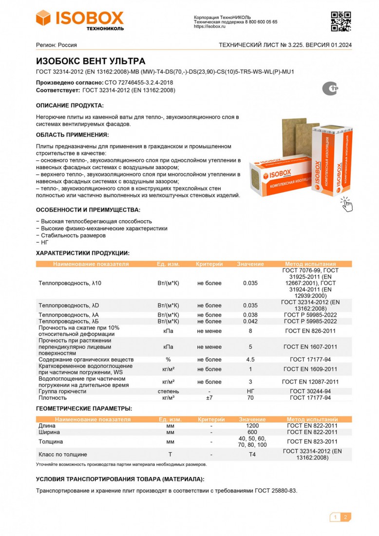 Минеральная вата Isobox ВЕНТ УЛЬТРА 70 кг/м3 1200х600х50 мм, 6 шт/упак купить в Сургуте по оптовой цене в интернет магазине СтройПлатформа. ИЗОБОКС ВЕНТ УЛЬТРА — негорючие плиты из каменной ваты для тепло-, звукоизоляционного слоя в системах вентилируемых фасадов.