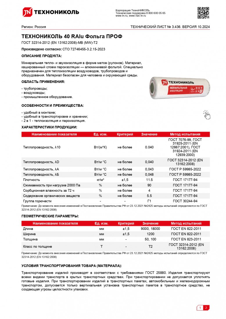 Минеральная вата Технониколь Фольга Проф 40 RAlu 18000х1200х50 мм, 1 шт/упак купить в Сургуте по оптовой цене в интернет магазине СтройПлатформа.