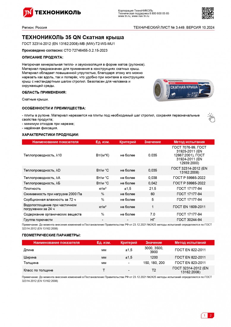 Негорючая минеральная тепло- и звукоизоляция в форме матов (рулонов). Материал предназначен для применения в конструкциях скатных крыш. Материал обладает повышенной упругостью, благодаря этому его можно нарезать как вдоль, так и поперёк, что удобно при монтаже в конструкциях крыш с нестандартным шагом стропил. Безопасен для человека и окружающей среды.