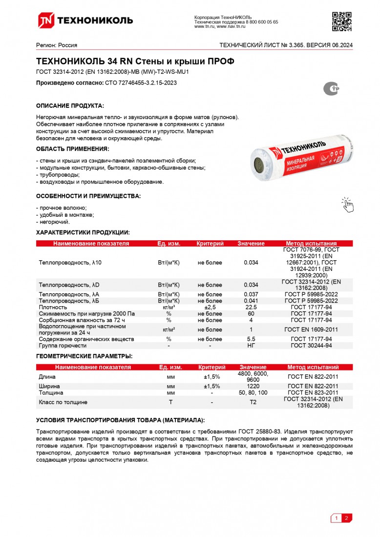 Минеральная вата Технониколь Стены и Крыши Проф 34 RN 9600х1220х50 мм, 1 шт/упак купить в Сургуте по оптовой цене в интернет магазине СтройПлатформа.