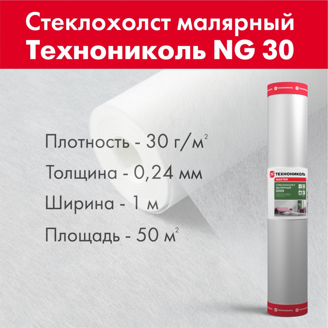 Стеклохолст малярный ТехноНиколь NG 30 1х50 м, рул купить в Сургуте по оптовой цене в интернет магазине СтройПлатформа. Стеклохолст малярный NG 30 - армирующий нетканый материал, на основе стекловолокна предназначенный для выравнивания и укрепления поверхностей стен и потолков, является идеальной основой для нанесения на него различных покрытий.