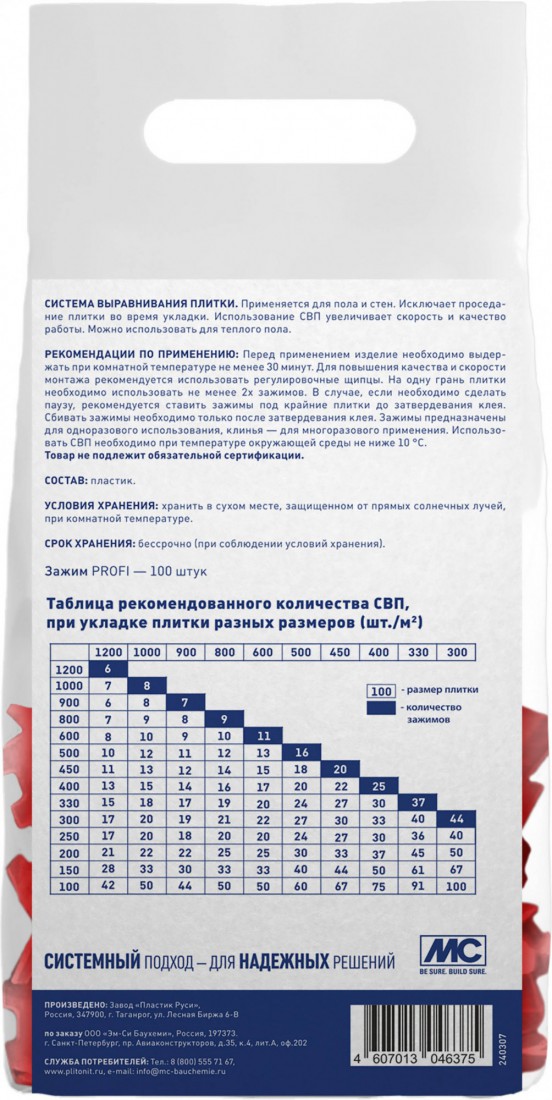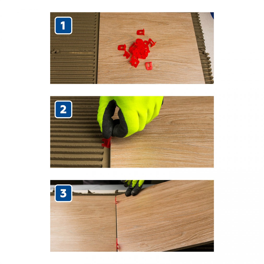 Зажимы предназначены для формирования межплиточных швов заданной ширины. Являются элементом системы выравнивания плитки (СВП). Используются для плитки толщиной от 3 до 12 мм. Зажимы изготавливаются из специального типа пластика – обладающего требуемой прочностью при затягивании и при этом хрупкого, что обеспечивает лёгкое удаление из шва перед затиркой. Зажимы представлены в 4 толщинах: 0,7 мм, 1 мм, 1,4 мм и 2 мм благодаря чему мастер имеет возможность выбрать наиболее подходящую ширину шва, равную толщине используемых зажимов. Для удобства работы каждый типоразмер имеет собственную цветовую идентификацию.