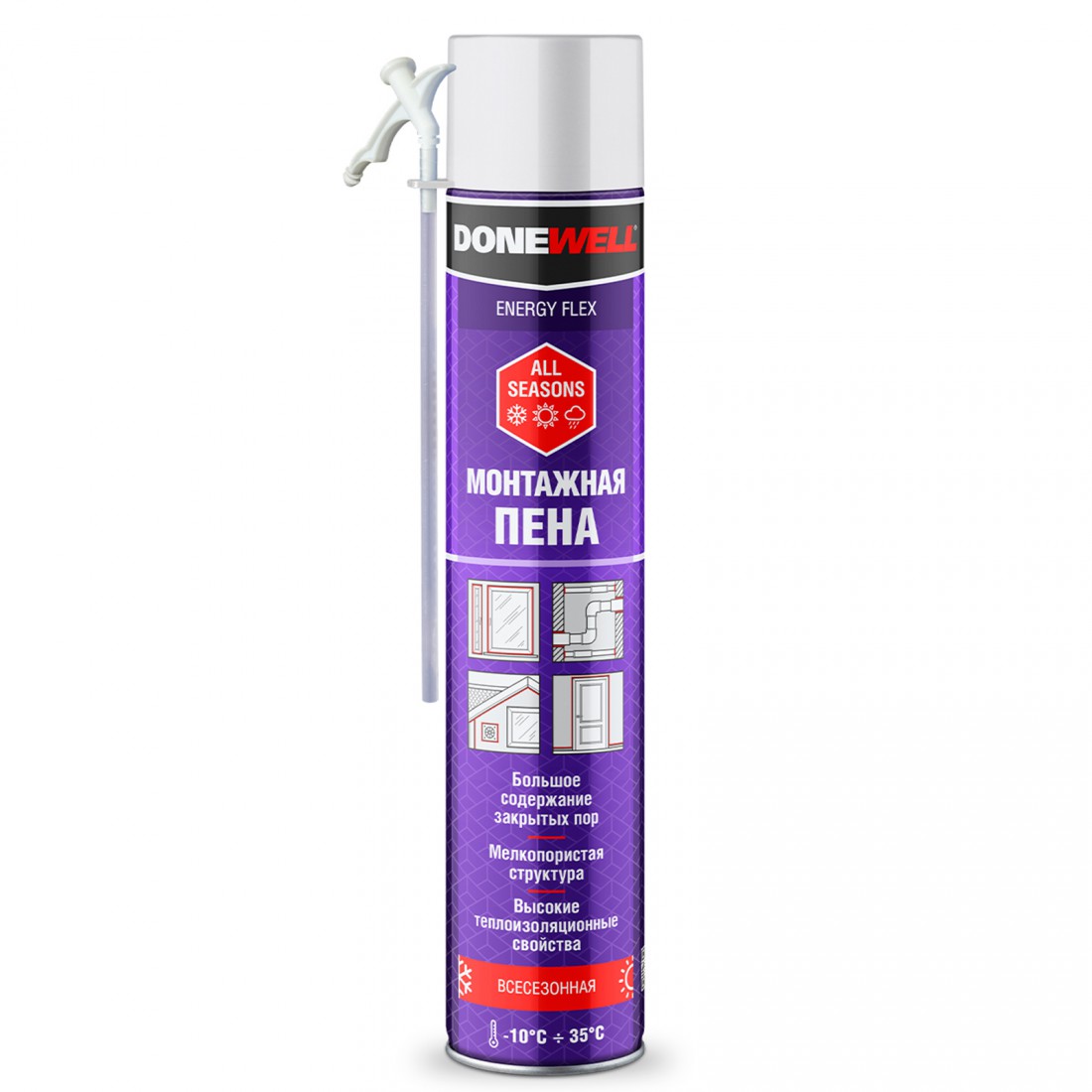 Пена монтажная бытовая Donewell Energy Flex всесезонная 1000 мл, шт купить в Сургуте по оптовой цене в интернет магазине СтройПлатформа. Высококачественная однокомпонентная полиуретановая монтажная пена отлично подходит для установки оконных и дверных блоков, подоконников, крепления стеновых панелей, герметизации щелей, пустот, тепло- и шумоизоляции швов, а также для других строительных и отделочных работ. Обладает высокой адгезией к большинству строительных материалов: бетон, кирпич, штукатурка, дерево, пластик (кроме полиэтилена, полипропилена и фторопласта). Обеспечивает равномерный, стабильный выход и идеальную мелкопористую структуру готовой пены.