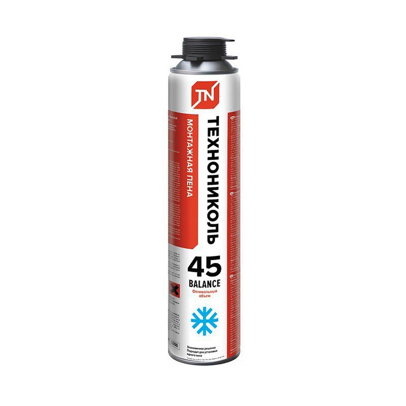 Пена ТехноНиколь 45 BALANCE зимняя представляет собой однокомпонентный полиуретановый материал в аэрозольной упаковке. Монтажная пена отличается умеренным первичным расширением, низким вторичным расширением. Пена обладает хорошей адгезией к большинству строительных материалов, за исключением фторопласта, силикона и полиэтилена.