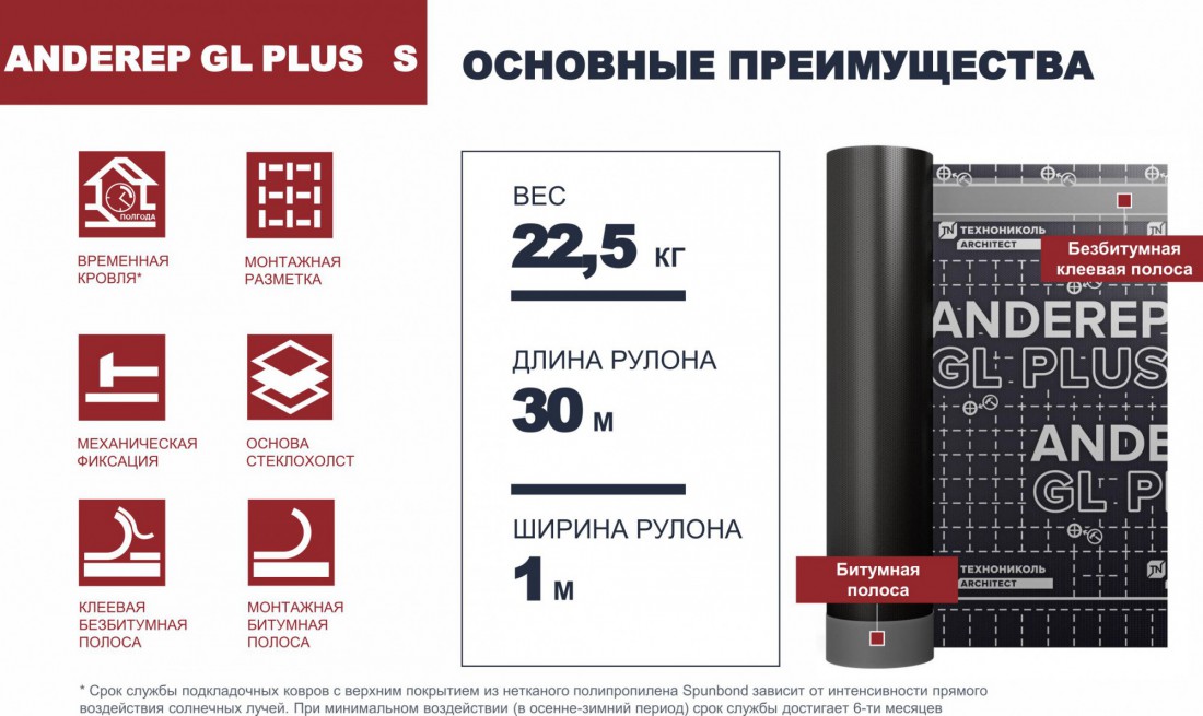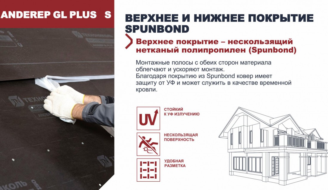 Подкладочный ковер ANDEREP GL PLUS S — это битумно-полимерный материал с механической фиксацией, предназначенный для укладки на основной площади кровли под гибкую битумную черепицу. В его основе используется прочный стеклохолст, а защитные покрытия выполнены из нетканого полипропилена. Для удобства монтажа на верхнее покрытие нанесена специальная разметка, ускоряющая укладку. Продукт оснащён продольными монтажными полосами: на верхней стороне — клеевая полоса, а на нижней — битумная, обе защищены силиконизированной пленкой.