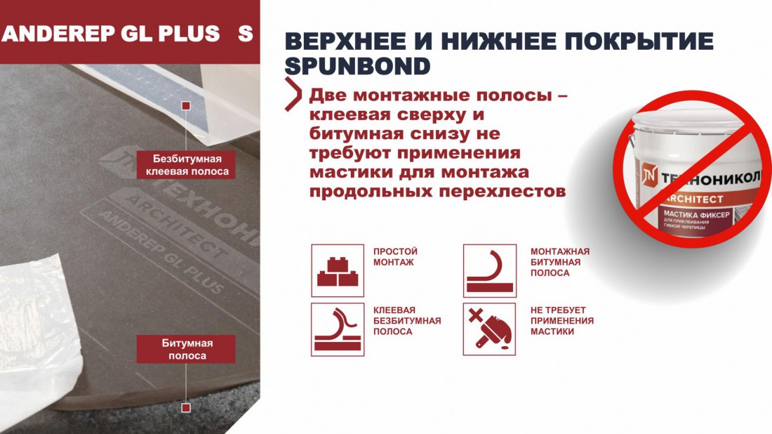 Используется в качестве дополнительного подкладочного слоя в конструкциях скатных кровель с финишным покрытием из гибкой битумной черепицы.