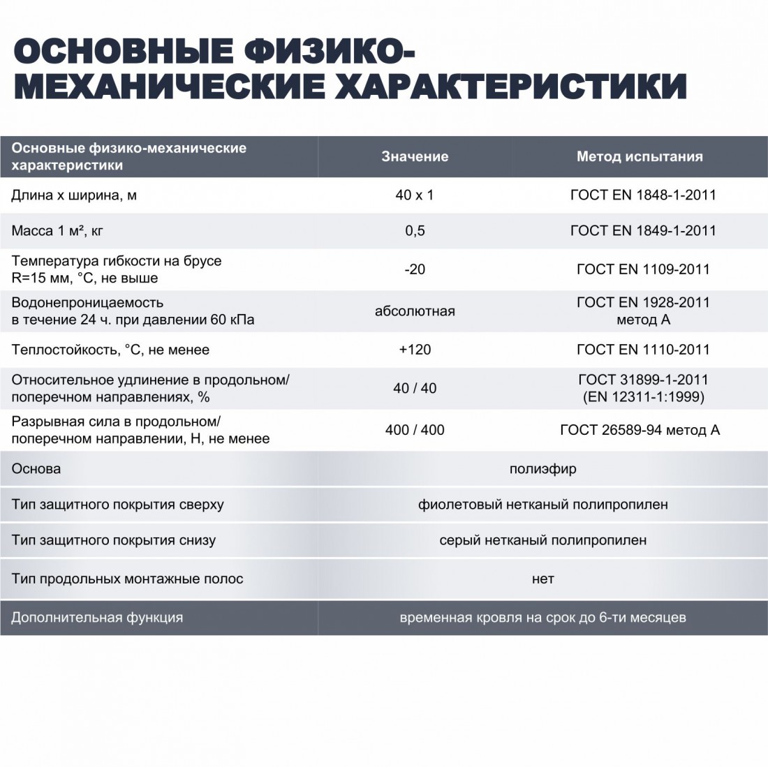 Относительное удлинение при максимальной силе растяжения в продольном направлении | % | ±15 | 40 | ГОСТ 31899-1-2011 (EN 12311-1:1999) |