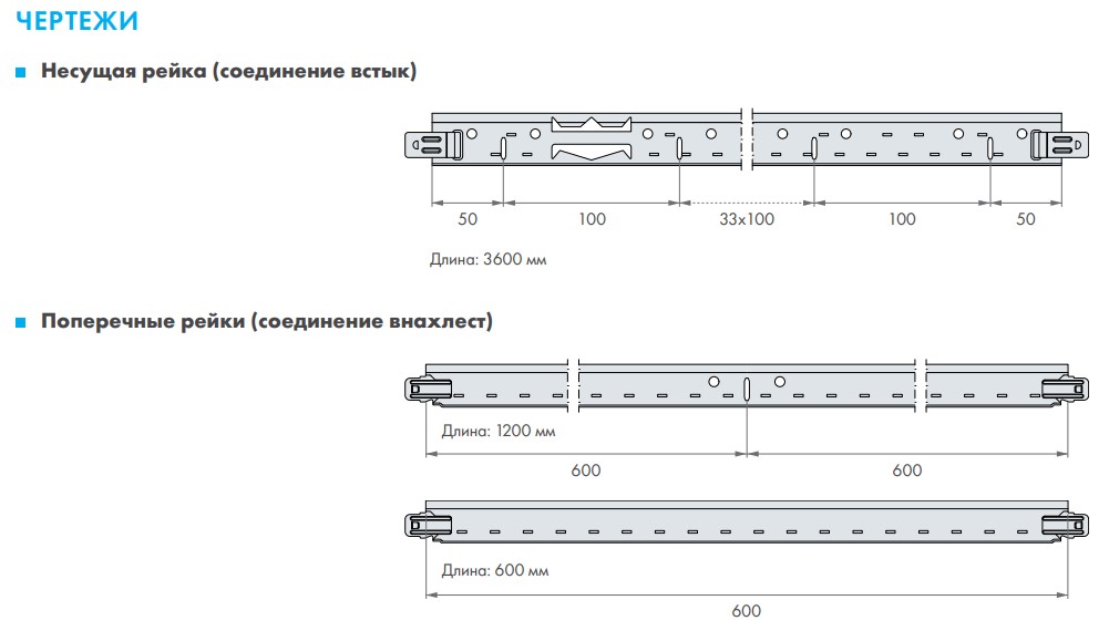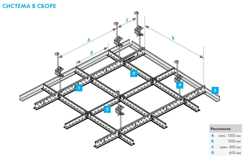 1. Оцинкованный каркас для подвесных потолков с использованием потолочных панелей из минерального волокна. Окрашен полиэфирной краской – белой (RAL 9003).