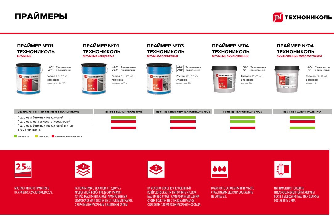 - Огрунтовка цементно-песчаных, бетонных, кирпичных и других впитывающих строительных поверхностей перед укладкой рулонных наплавляемых, самоклеящихся, мастичных кровельных и гидроизоляционных материалов на битумной основе.
