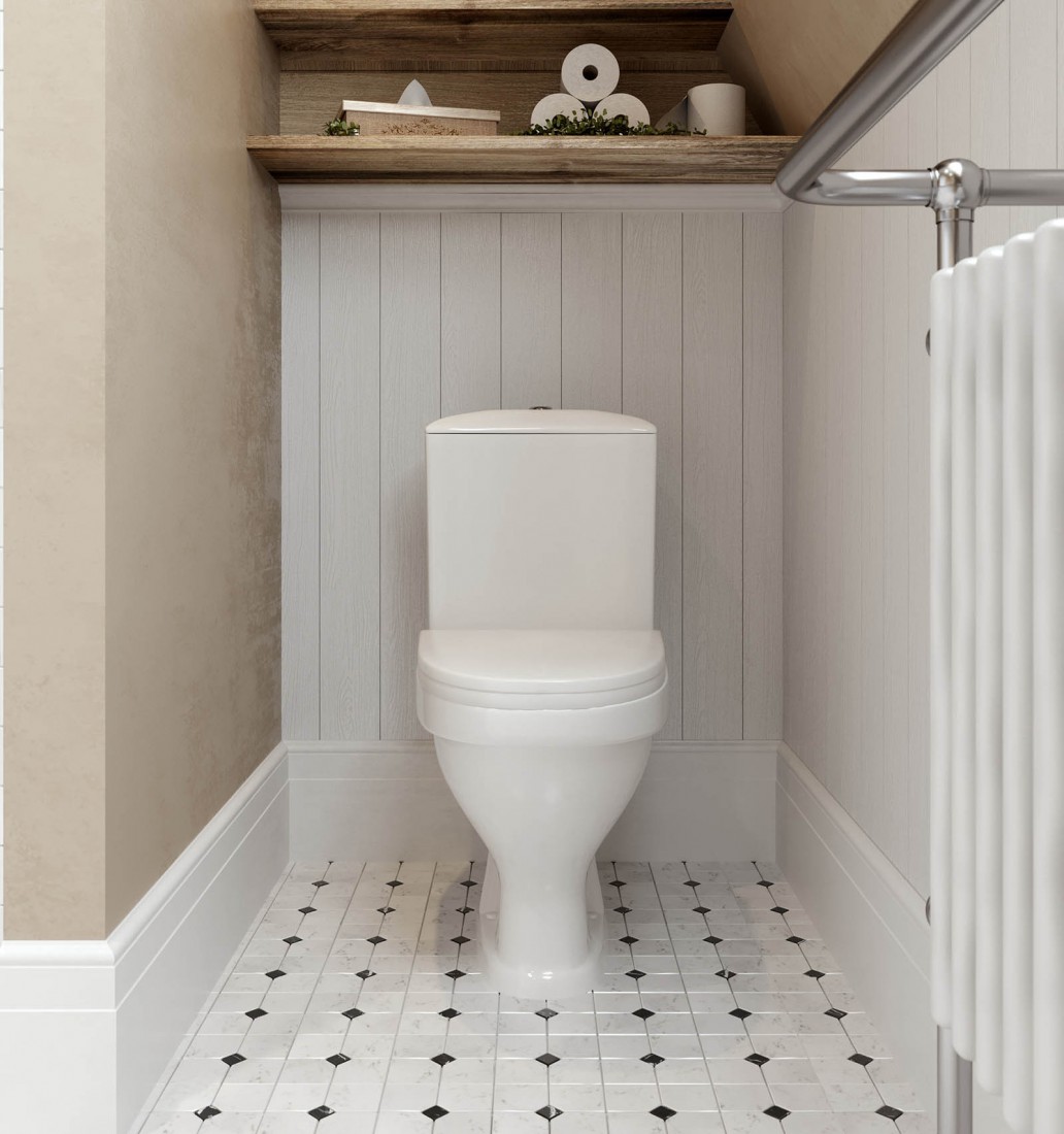 Santeri Вест — напольный унитаз с базовой комплектацией и прочной фарфоровой чашей, рассчитанный на установку в стандартных санузлах. Косой выпуск облегчает подключение к существующей системе канализации, особенно в домах старого типа.