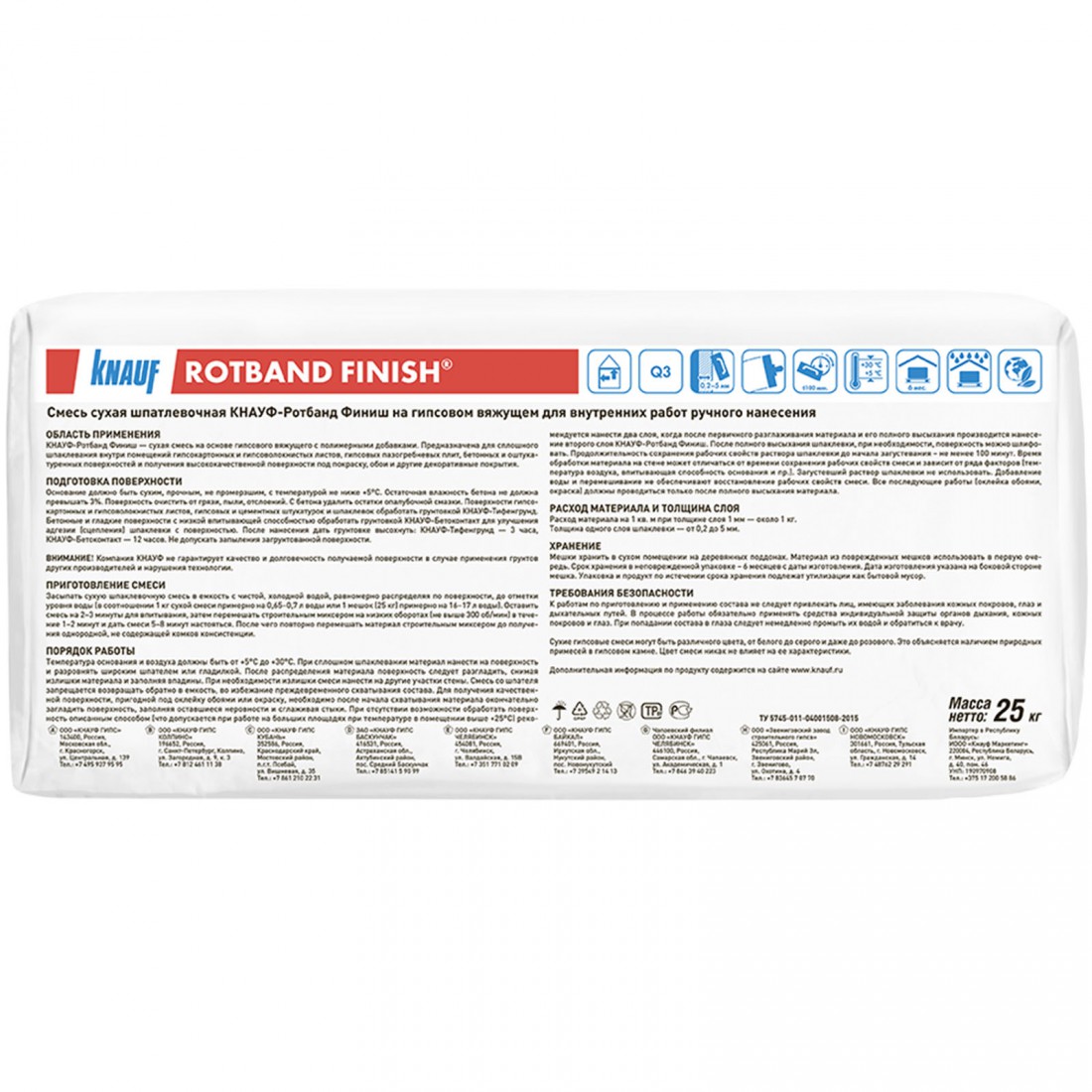 Шпаклевка гипсовая Knauf Ротбанд-Финиш финишная, слой 0,2-5 мм, 25 кг, шт купить в Сургуте по оптовой цене в интернет магазине СтройПлатформа. Knauf Ротбанд-Финиш - сухая шпаклевочная смесь на основе гипса и полимерных добавок предназначена для финишного выравнивания поверхностей внутри помещений. Образует гладкое покрытие, готовое под покраску, оклейку обоями или нанесение декоративных покрытий.