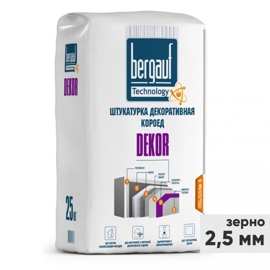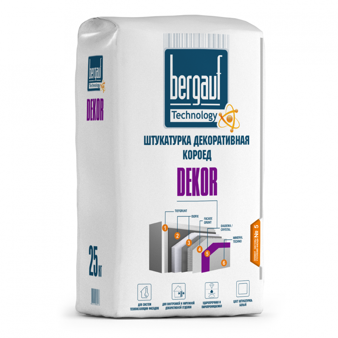 Штукатурка декоративная Bergauf Dekor Короед, зерно 2,5 мм, белая, 25 кг, шт купить в Сургуте по оптовой цене в интернет магазине СтройПлатформа. Декоративная штукатурка с фактурой "короед" предназначена для наружной и внутренней отделки. Подходит для фасадов, стен в помещениях с нормальной и повышенной влажностью, а также для систем теплоизоляции. Обладает высокой прочностью, паропроницаемостью и устойчивостью к механическим нагрузкам.