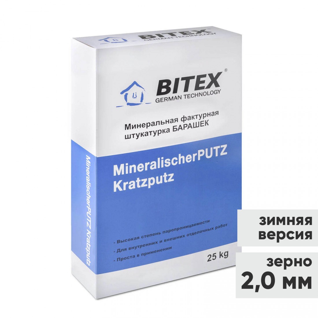 Штукатурка декоративная Bitex MineralischerPutz Kratzputz Winter ЗИМА Барашек зерно 2,0 мм, белая, 25 кг, шт купить в Сургуте по оптовой цене в интернет магазине СтройПлатформа. Белая минеральная штукатурка с равномерно-шероховатой структурой "барашек" предназначена для декоративной отделки фасадов и внутренних стен. В состав входят известь, белый цемент и мраморная крошка, что обеспечивает высокую прочность и долговечность покрытия. Продукт идеально сочетается с системами утепления, особенно при использовании минеральной ваты в качестве теплоизоляции, а также подходит для декоративной отделки стен без утепления.