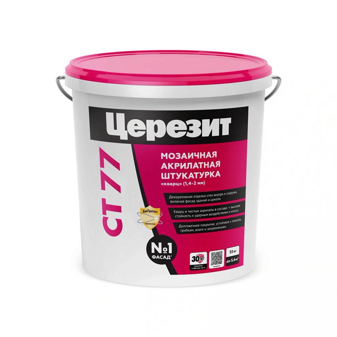 Штукатурка декоративная Церезит СТ 77 акриловая мозаичная, база, 7,15 кг, шт купить в Сургуте по оптовой цене в интернет магазине СтройПлатформа. Ceresit CT 77 «Мозаичная» акрилатная штукатурка 1,4–2,0 мм «кварц» — декоративное покрытие на акрилатной основе с цветной кварцевой крошкой. Формула содержит биоцидные добавки, препятствующие развитию плесени, грибка и загрязнений, что увеличивает срок службы фасада. После высыхания образует прочный, износостойкий слой с мозаичной фактурой.